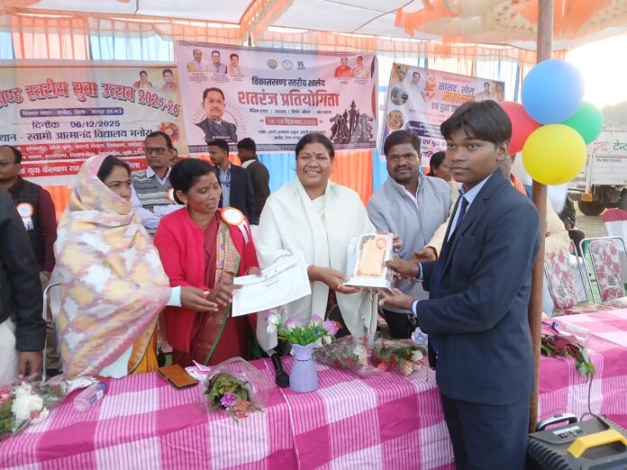जिला कलेक्टर जशपुर श्री रोहित व्यास के विशेष पहल एवं राज्य शासन के निर्देशानुसार खेल एवं युवा कल्याण व शिक्षा विभाग के समन्वित प्रयास से क्रमशः विकास खंड स्तरीय शालेय शतरंज प्रतियोगिता, सांसद खेल महोत्सव एवं युवा उत्सव 2025 का आयोजन स्वामी आत्मानंद विधालय मनोरा के प्रांगण-मैदान में दिनाँक 06 दिसम्बर 2025 को जशपुर विधायक माननीया श्रीमती रायमुनि भगत के मुख्य आतिथ्य में विकासखंड शिक्षा अधिकारी मनोरा तरुण कुमार पटेल एवं रघुनाथ राम मुख्य कार्यपालन अधिकारी जनपद पंचायत के कुशल नेतृत्व में संपन्न हुआ।