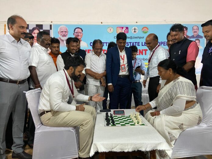जशपुर में छत्तीसगढ़ स्टेट लेवल ओपन चेस टूर्नामेंट का हुआ शुभारंभ।विधायक रायमुनी भगत ने शतरंज खेलकर टूर्नामेंट की औपचारिक शुरुआत की ।कलेक्टर रोहित व्यास और सीईओ अभिषेक कुमार ने भी खेल शतरंज।
