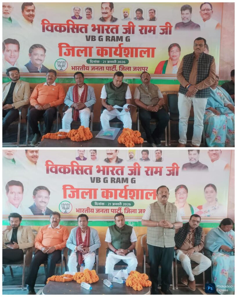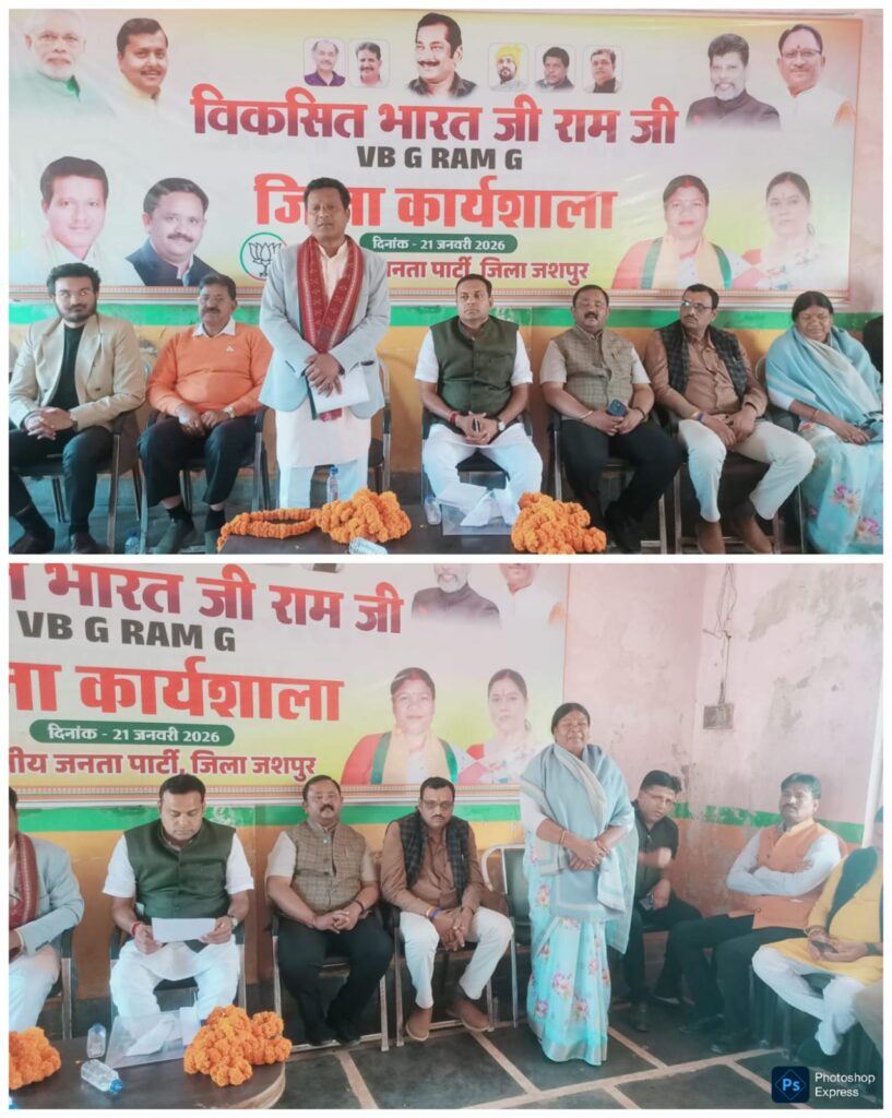 विकसित भारत के संकल्प को धरातल पर उतारने के उद्देश्य से “विकसित भारत – VB G राम G” अभियान को लेकर जिला भाजपा कार्यालय जशपुर में जिला स्तरीय कार्यशाला का आयोजन किया गया। कार्यशाला में जनप्रतिनिधियों, संगठन पदाधिकारियों और कार्यकर्ताओं ने उत्साहपूर्वक सहभागिता की।