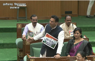 रायपुर। छत्तीसगढ़ विधानसभा के शीतकालीन सत्र का चौथा दिन हंगामे के साथ शुरू हुआ. कांग्रेस विधायक अपने सीने पर मनरेगा का नाम बदले जाने के विरोध में पोस्टर लगाकर पहुंचे थे, इस पर सत्ता पक्ष के विधायकों ने आपत्ति जताई. इस पर आसंदी ने व्यवस्था का हवाला देते हुए कांग्रेस विधायकों से पोस्टर-बैनर बाहर निकालकर प्रश्नकाल में शामिल होने को कहा.
