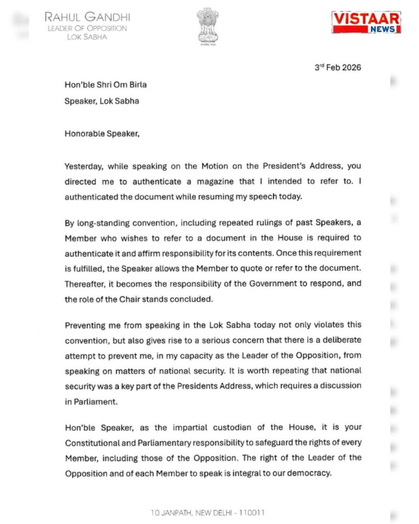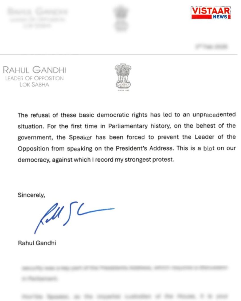 लोकसभा में प्रतिपक्ष के नेता राहुल गांधी ने लोकसभा स्पीकर को पत्र लिखकर नेता प्रतिपक्ष को राष्ट्रपति के अभिभाषण पर न बोलने देने का आरोप लगाया है,