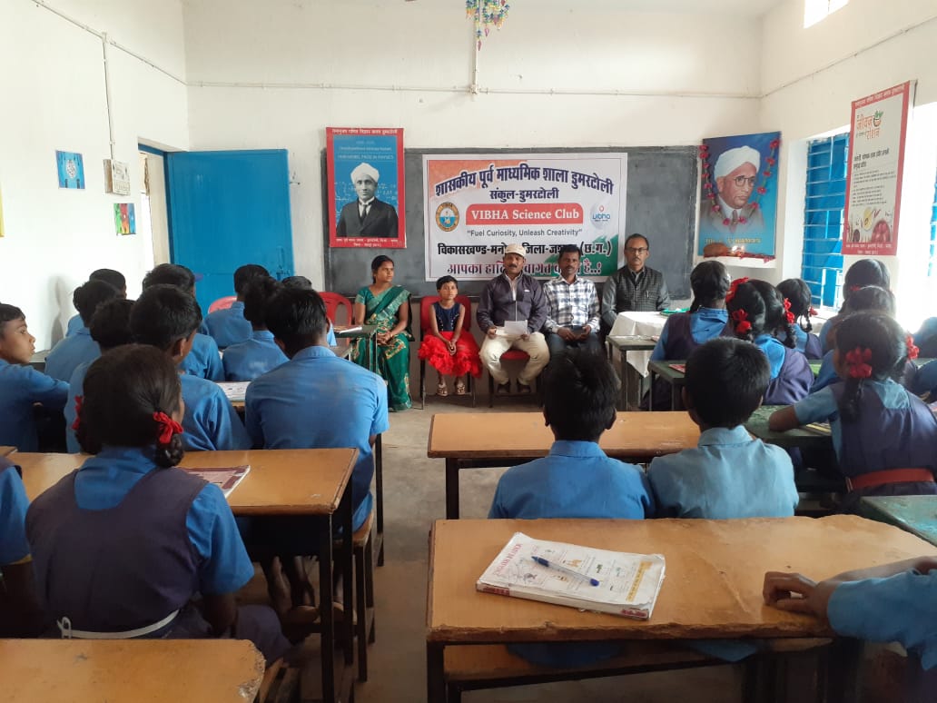 विकासखंड शिक्षा अधिकारी मनोरा संजय पटेल के मार्गदर्शन में विकासखंड के सभी विद्यालयों में राष्ट्रीय विज्ञान दिवस कार्यक्रम मनाया गया। छत्तीसगढ़ शासन के निर्देशानुसार इस वर्ष विद्यालय के कोऑर्डिनेटर एवं विद्यार्थियों के साथ मिलकर विभा साइंस क्लब के तत्वाधान में विज्ञान गणित से संबंधित एक्टिविटी कराई जानी थी इसी क्रम में माध्यमिक शाला डूमरटोली में विज्ञान विषय पर आधारित प्रतियोगी परीक्षा का आयोजन किया गया जिसमें विज्ञान से संबंधित 50 प्रश्न तैयार किए गए थे जिसका उत्तर अन्य प्रतियोगी परीक्षा की भांति ओएमआर शीट में भरा गया संजीव यादव किरण राम महारथी मंत्री बाई (शिक्षकों) द्वारा प्रश्न पत्र तैयार करना एवं परीक्षा से संबंधित समस्त गतिविधियों को व्यवस्थित रूप से संपन्न करवाया गया. प्रवीण पाठक प्रधान पाठक ने बताया कि इस तरह की परीक्षा का आयोजन अंतिम आकलन परीक्षा विषय विज्ञान को ध्यान में रखकर किया गया है ताकि बच्चों को इसका लाभ मिल सके।