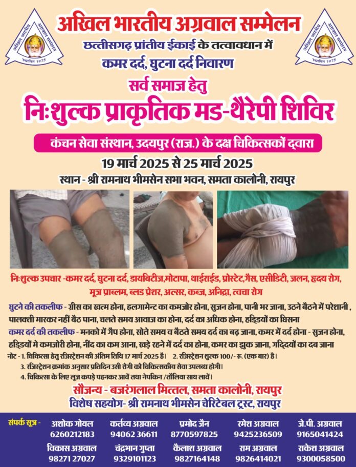 रायपुर-अखिल भारतीय अग्रवाल सम्मेलन की छत्तीसगढ़ इकाई द्वारा रायपुर में दिनांक 19 से 25 मार्च तक प्राकृतिक मड थेरेपी शिविर का आयोजन किया गया है,