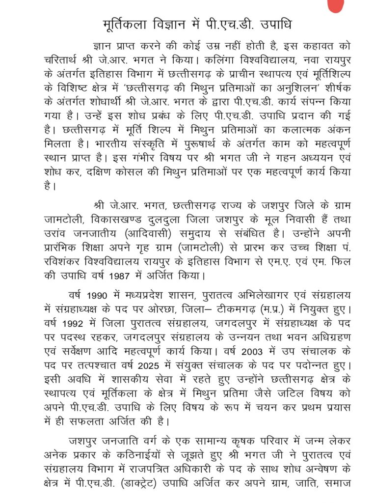Homeछत्तीसगढ़मूर्ति कला विज्ञान में श्री जे आर भगत दुलदुला को मिली पी... छत्तीसगढ़सामाजिक मूर्ति कला विज्ञान में श्री जे आर भगत दुलदुला को मिली पी एच डी की उपाधि, By Ravindra Singh Bhatia November 27, 2025 0 128 Share FacebookTwitterWhatsApp रायपुर Join Whatsapp GroupJoin Whatsapp Group Share FacebookTwitterWhatsApp Previous articleछत्तीसगढ़ के तीन युवाओं ने रिकॉर्ड बनाया: 16 दिन में कश्मीर से कन्याकुमारी तक 4,000 किमी की साइकिल यात्रा पूरी कीNext articleजमीन गाइडलाइन को लेकर वित्त मंत्री ओपी चौधरी का बड़ा बयान—उन्होंने कहा कि शराब, कोयला और महादेव सट्टा से आने वाले पैसों को खपाने के लिए कांग्रेस ने ऐसा किया… Ravindra Singh Bhatiahttps://ppnews.inChief Editor PPNEWS.IN. More Details 9755884666 RELATED ARTICLES छत्तीसगढ़ जिला पंचायत सीईओ अभिषेक कुमार ने यशस्वी जशपुर कार्यक्रम के तहत ली प्राचार्यों की समीक्षा बैठक।हायर सेकेंडरी पण्डरापाठ और टट्केला के प्राचार्यो को शो-काज... November 29, 2025 छत्तीसगढ़ गजराज का आतंक जारी, सो रहे पति-पत्नी को कुचलकर मार डाला November 29, 2025 छत्तीसगढ़ वनडे मैच के दौरान बेहतर नेटवर्क सुविधा देने के लिए BSNL और JIO कर रहे हैं तैयारी… BCCI स्पाइडर कैमरे की व्यवस्था भी कर... November 29, 2025 - Advertisment - Most Popular जिला पंचायत सीईओ अभिषेक कुमार ने यशस्वी जशपुर कार्यक्रम के तहत ली प्राचार्यों की समीक्षा बैठक।हायर सेकेंडरी पण्डरापाठ और टट्केला के प्राचार्यो को शो-काज... November 29, 2025 गजराज का आतंक जारी, सो रहे पति-पत्नी को कुचलकर मार डाला November 29, 2025 वनडे मैच के दौरान बेहतर नेटवर्क सुविधा देने के लिए BSNL और JIO कर रहे हैं तैयारी… BCCI स्पाइडर कैमरे की व्यवस्था भी कर... November 29, 2025 600 करोड़ रुपए का बिजली बिल बकाया November 29, 2025 Load more
