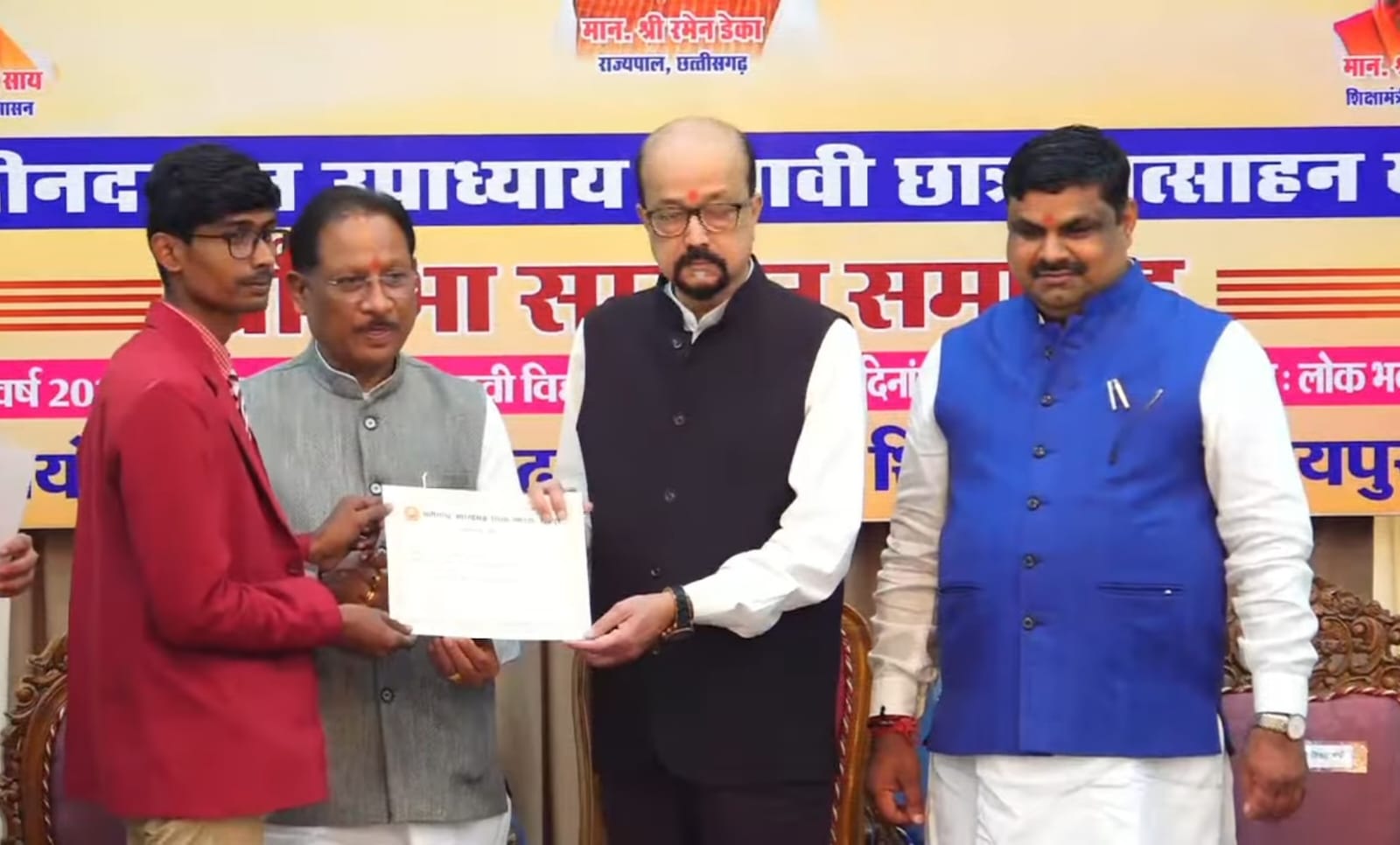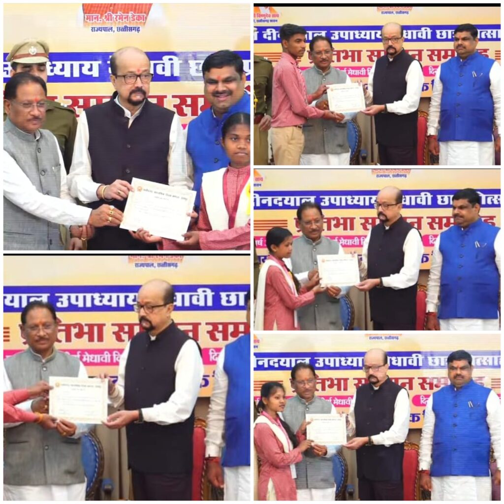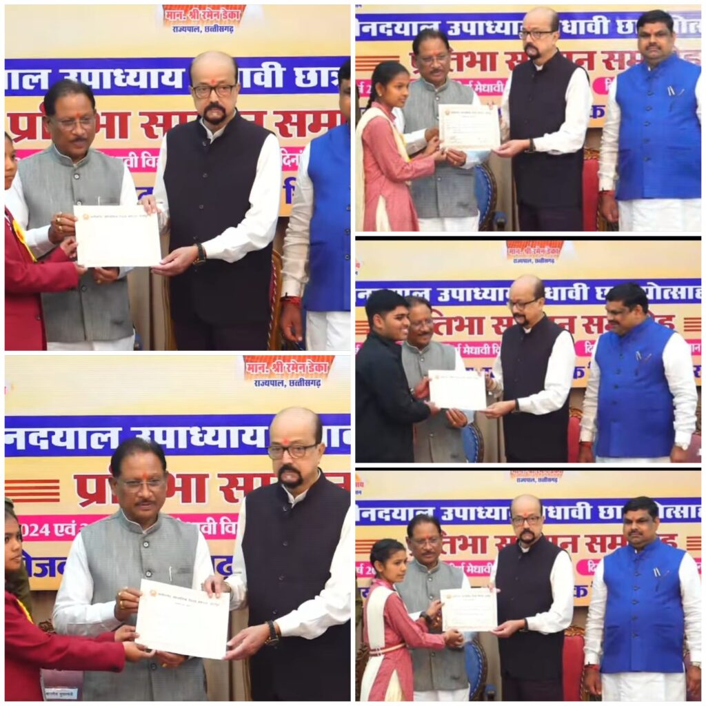 लोकभवन के छत्तीसगढ़ मण्डपम् में माध्यमिक शिक्षा मंडल द्वारा आयोजित इस प्रतिभा सम्मान समारोह में पंडित दीनदयाल उपाध्याय मेधावी छात्र प्रोत्साहन योजना के तहत डेढ़ डेढ़ लाख रुपए से विद्यार्थियों को सम्मानित किया गया।