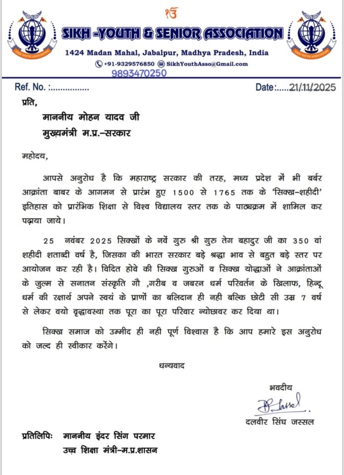 मध्य प्रदेश के मुख्य मंत्री श्री मोहन यादव जी एवं उच्च शिक्षा मंत्री श्री इंदर सिंह परमार से “सिक्ख यूथ &सीनियर एसोसिएशन इंडिया” रजि. के अध्यक्ष स.दलवीर सिंघ जस्सल द्वारा एक पत्र लिखते हुए अनुरोध किया कि महाराष्ट्र सरकार की तरह , मध्य प्रदेश में भी बर्बरआक्रांता बाबर के आगमन से प्रारंभ हुए 1500 से 1765 तक के “सिक्ख-शहीदी” इतिहास को प्रारंभिक शिक्षा से विश्व विद्यालय स्तर तक के पाठ्यक्रम में शामिल कर पढ़ाया जाय ।