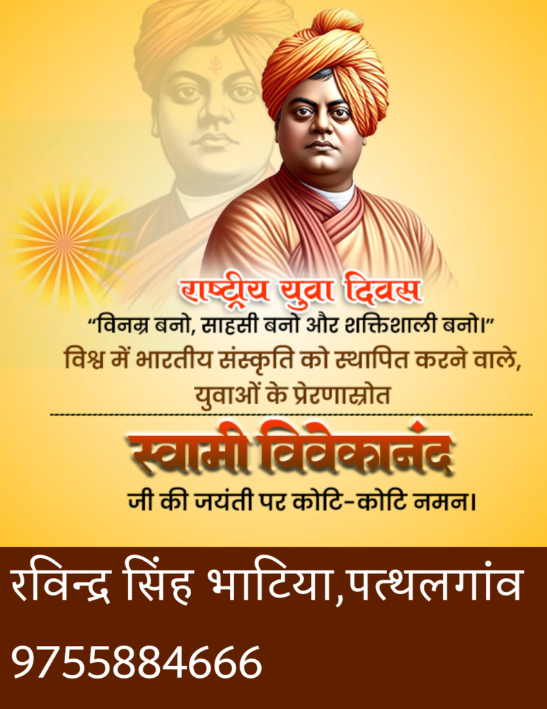 उठो जागो और तब तक नहीं रुको जब तक लक्ष्य प्राप्त न हो जाए,स्वामी जी के शिकागो में विश्व धर्म सभा को संबोधित करते हुए जो युवाओं को आव्हान किया आज उनकी जयंती पर हमारा यही प्रण होना चाहिए उक्त विचार व्यक्त करते हुए श्री रविन्द्र भाटिया ने स्कूली बच्चों को भी आव्हान किया हमारा भी वर्तमान में परीक्षाएं नजदीक है इसलिए लक्ष्य होना चाहिए कि कैसे hm तैयारी करे कि स्कूल,परिवार ओर क्षेत्र का नाम रौशन हो,